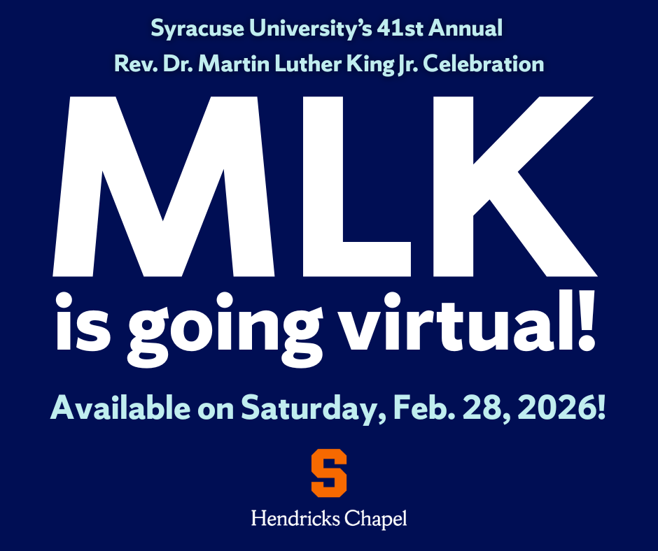 For more information about the MLK Celebration or to request accommodations, contact Hendricks Chapel at chapel@syr.edu or 315.443.2901. Learn more about this and other Hendricks Chapel events by visiting chapel.syracuse.edu